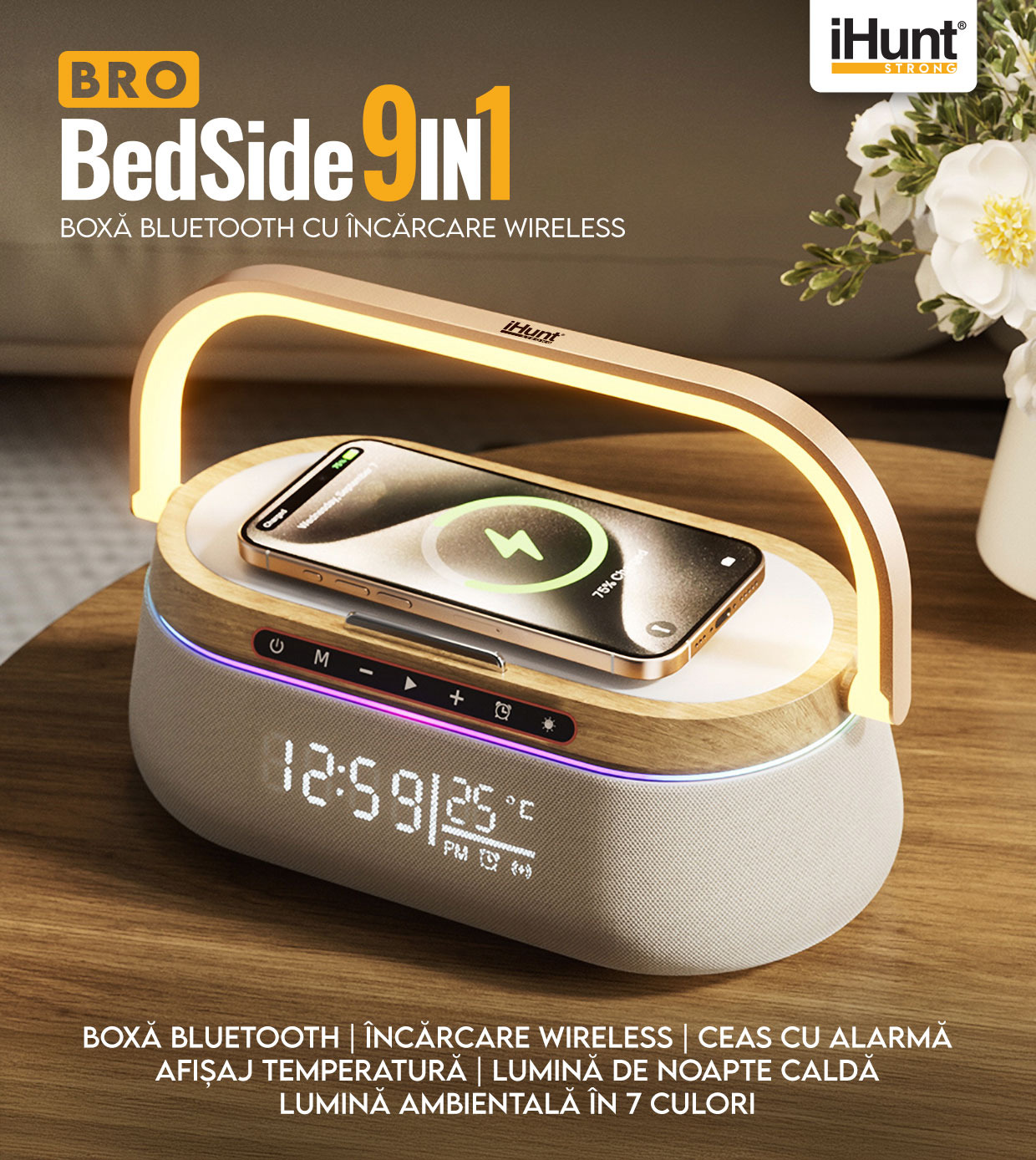 Redefinește confortul casei tale cu iHunt BedSide 9 in 1, un dispozitiv multifuncțional de lux ce combină estetica naturală a lemnului cu tehnologia de ultimă oră. Acest hub inteligent este conceput pentru a elimina aglomerația de pe noptieră sau birou, oferindu-ți într-un singur obiect rafinat o boxă de top, un încărcător rapid și un sistem de iluminare ambientală care îți transformă complet camera.