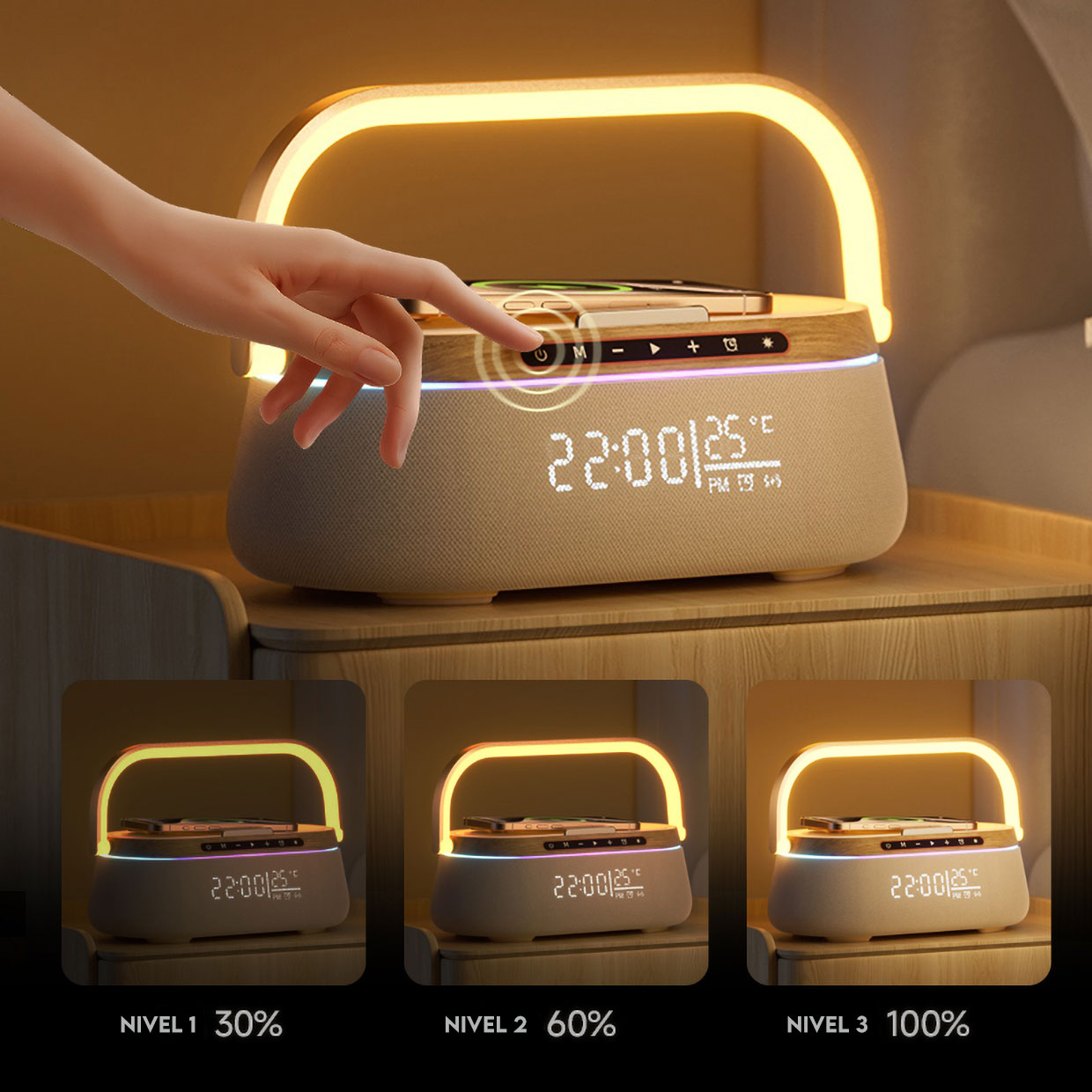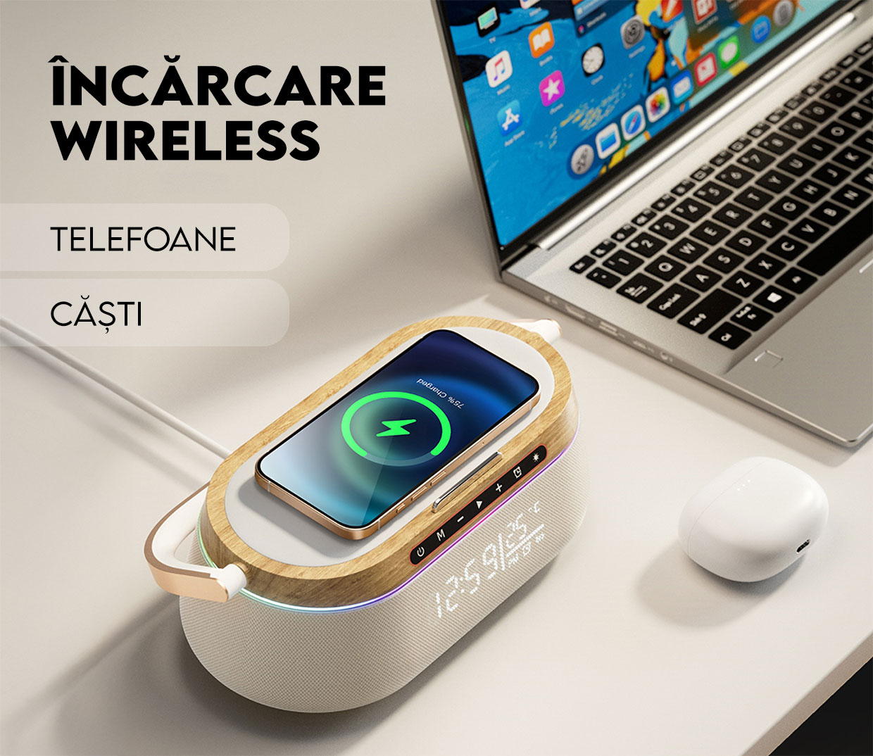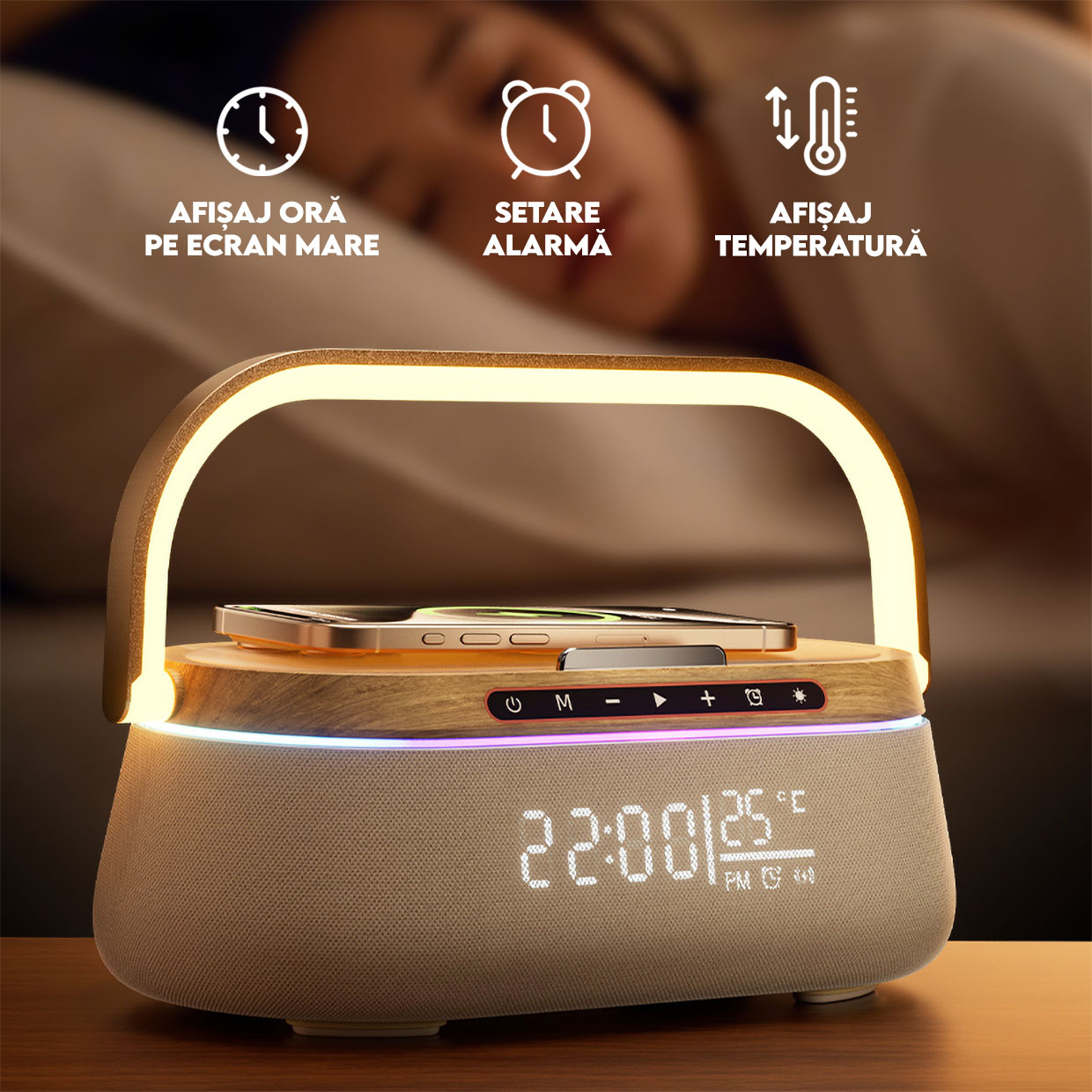 Functii: Boxa BT, Incarcator Wireless, Lampa LED (3 nivele), RGB LED, Ceas, Alarma