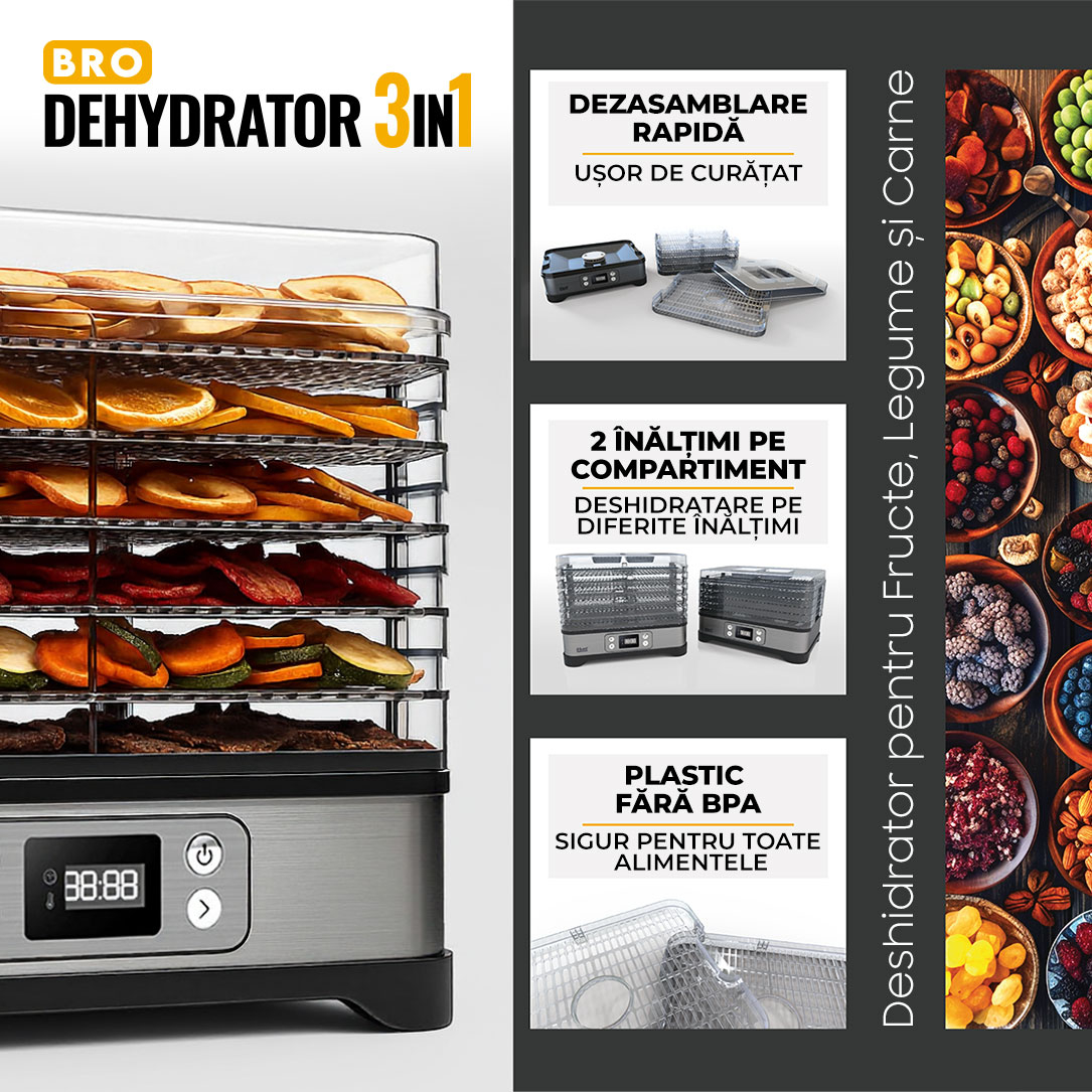 Îți dorești să te bucuri de fructe dulci și aromate, legume crocante sau carne fragedă tip jerky, fără conservanți și aditivi? Cu iHunt Bro 3 în 1 Dehydrator poți pregăti în fiecare zi gustări sănătoase pentru întreaga familie. Simplu de utilizat, economic și extrem de versatil, acest aparat transformă alimentele preferate în delicii naturale, perfecte pentru birou, școală, drumeții sau serile petrecute acasă.