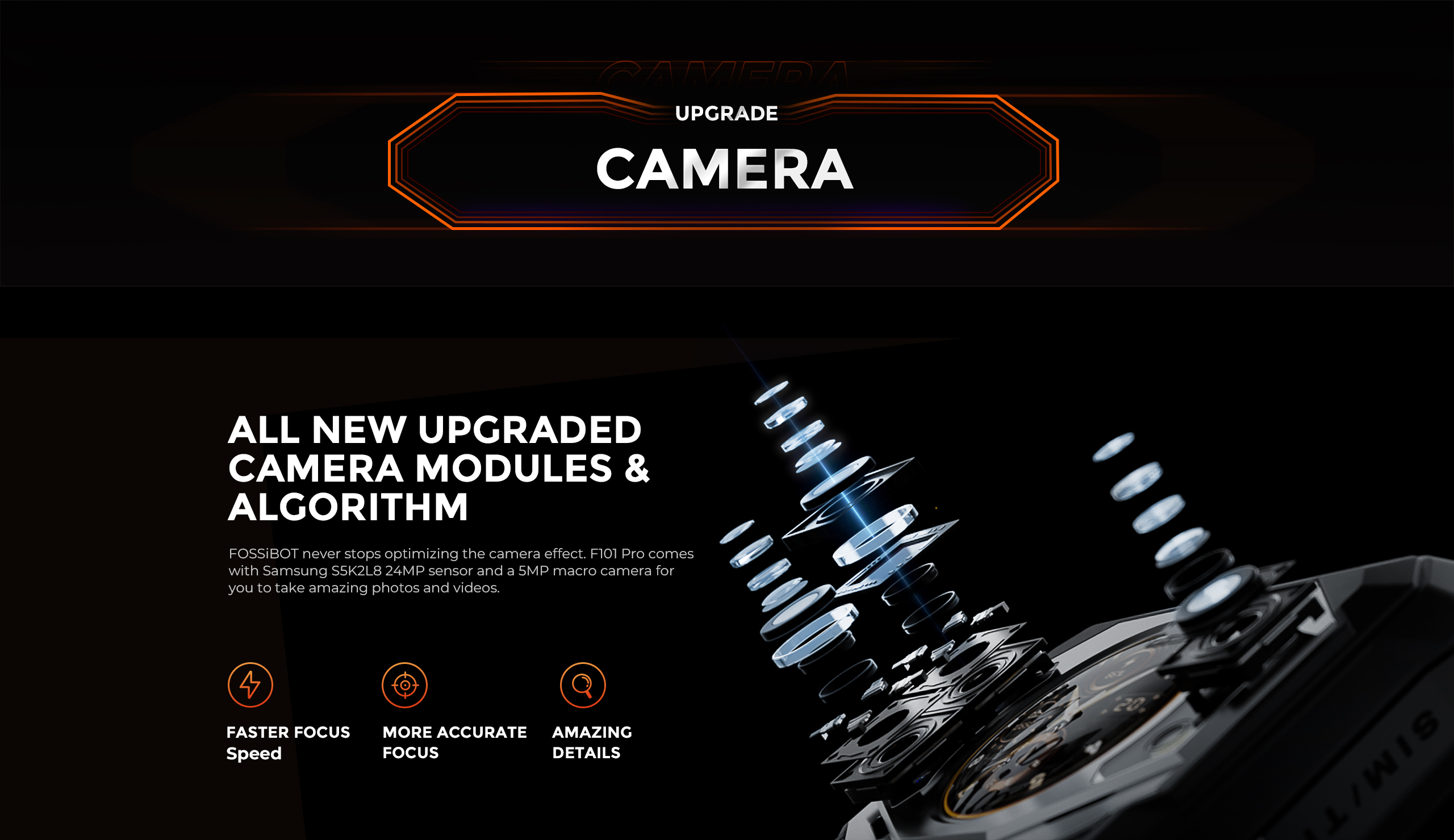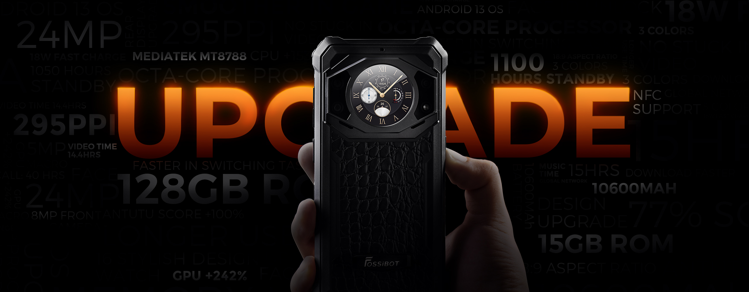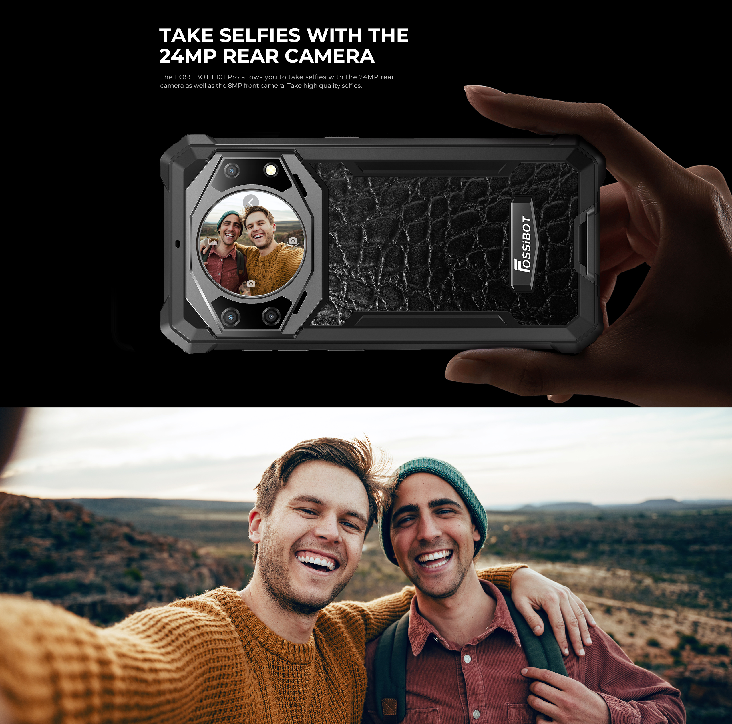 Cu dimensiunile de 155.7x76.2x20.35mm și greutatea de doar 350 grame, F101 Pro este un smartphone rugged surprinzător de compact și ușor pentru categoria sa. Designul cu model litchi (piele texturată) oferă grip excelent și aspect premium, disponibil în variante de culoare negru și portocaliu. Dimensiunile reduse permit transport facil în buzunar și utilizare confortabilă prelungită.