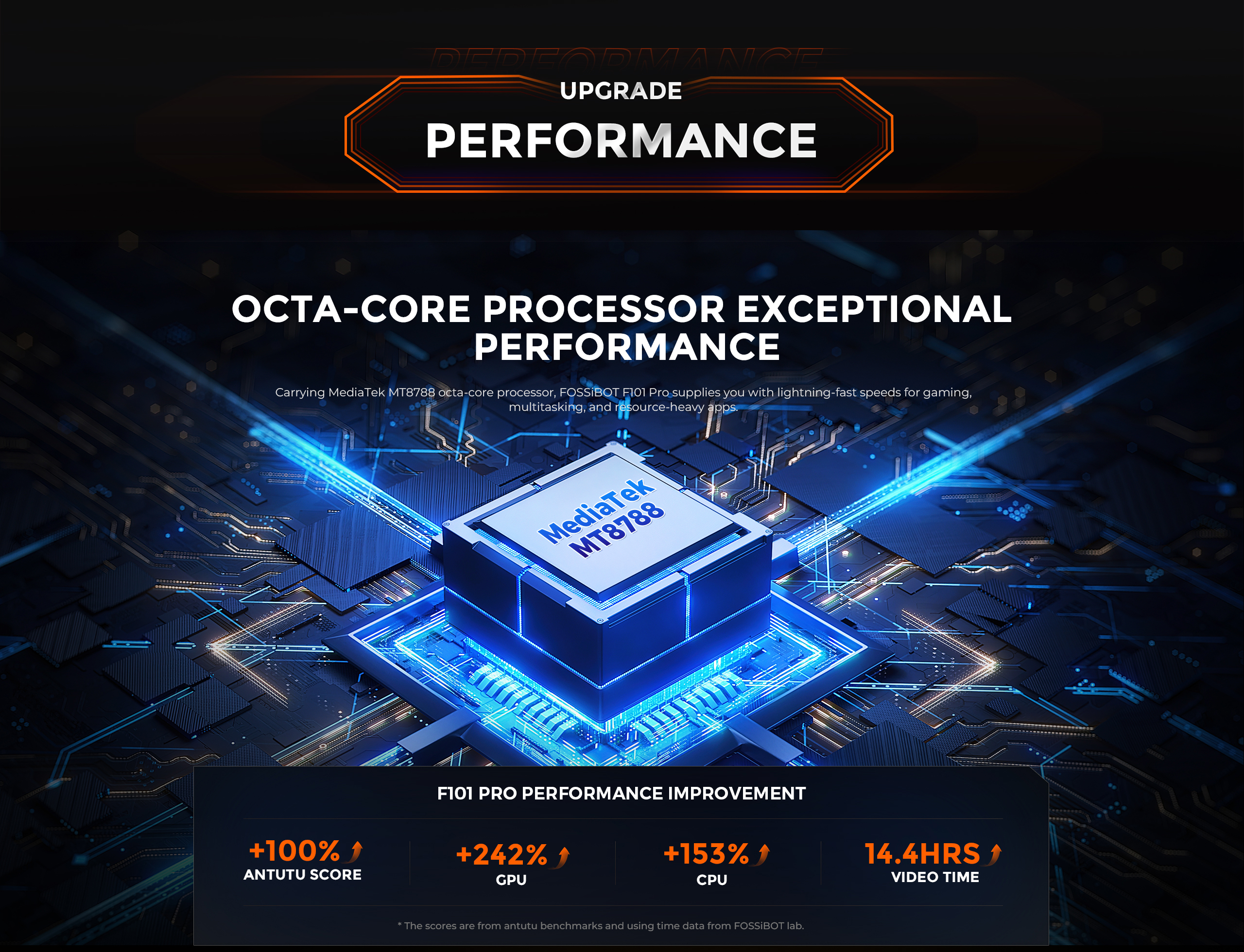 Chipset-ul MediaTek MT8788 Helio P60 oferă performanță substanțial superioară față de modelele F101 și F101P din seria anterioară. Arhitectura octa-core cu 4 nuclee Cortex-A73 la 2.0GHz și 4 nuclee Cortex-A53 la 2.0GHz, împreună cu GPU-ul Mali-G72 MP3, asigură rulare fluidă pentru aplicații demanding, multitasking eficient și gaming casual fără lag-uri sau încetiniri.