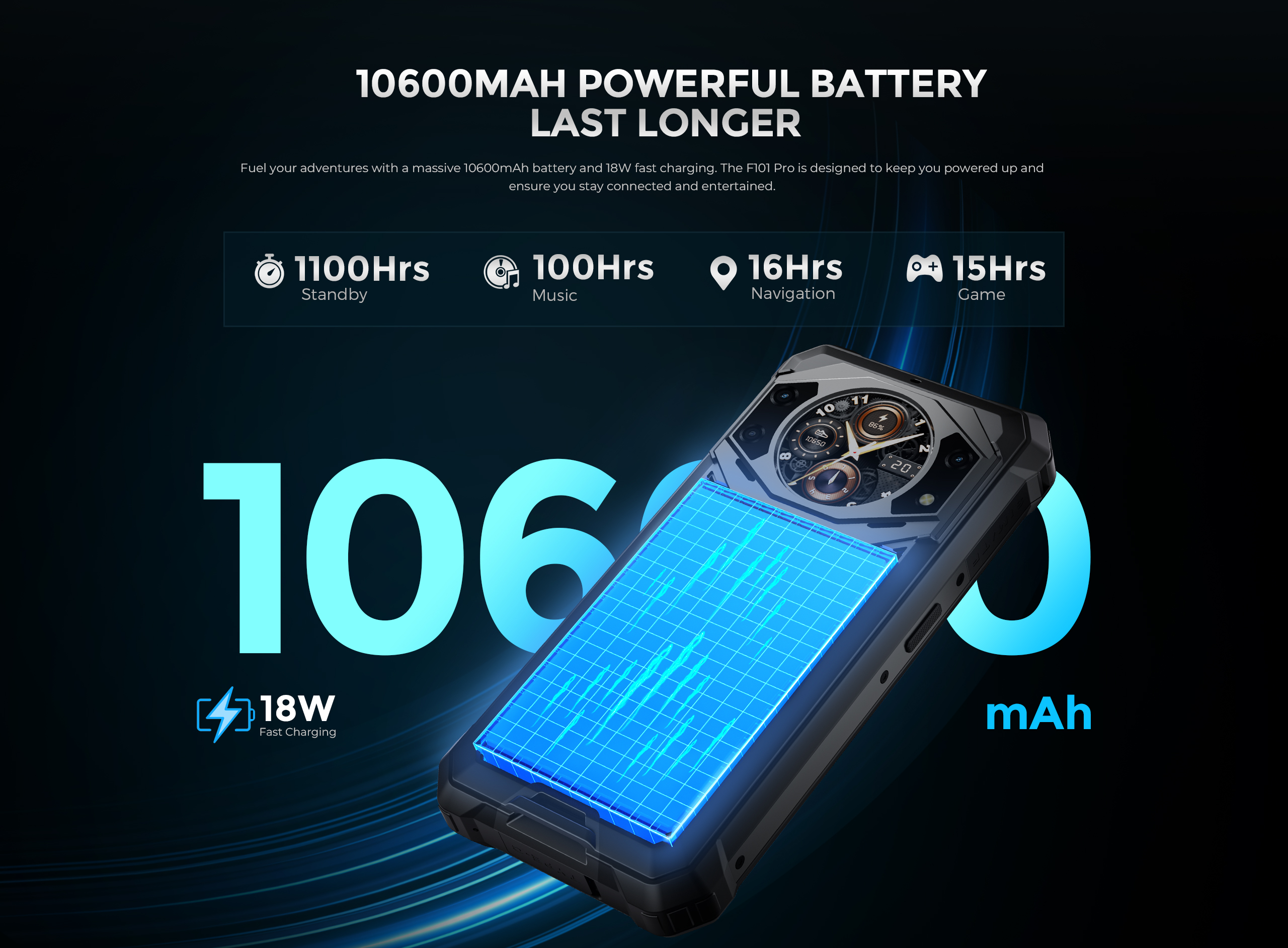 Bateria masivă de 10600mAh oferă autonomie extraordinar. Tehnologia de încărcare rapidă 18W permite alimentare completă în aproximativ 3 ore, iar funcția OTG reverse charging transformă F101 Pro într-un powerbank portabil pentru încărcarea altor dispozitive.