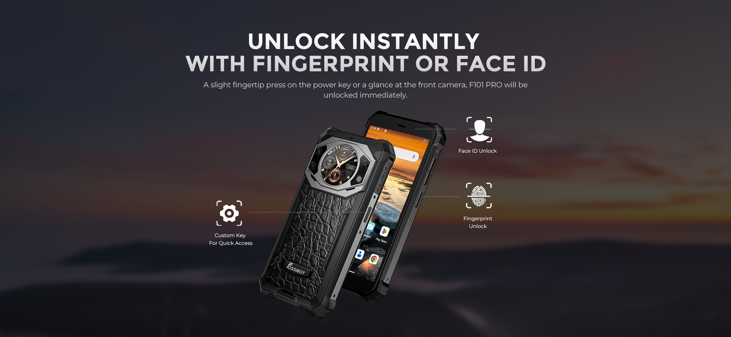 F101 Pro include set complet de senzori: accelerometru pentru orientare automată, senzor de proximitate pentru dezactivare display în timpul apelurilor, busolă digitală pentru navigație și orientare în teren. Butonul customizabil programabil permite acces rapid la funcții favorite precum lanterna, cameră, aplicații sau comenzi rapide definite de utilizator.