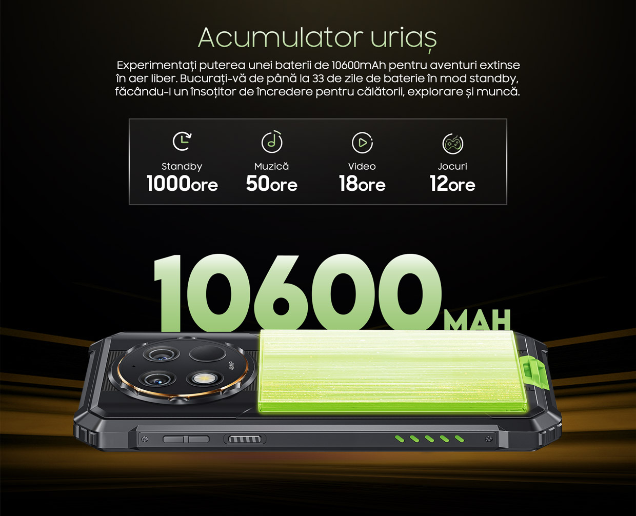 Rezistența peste tot, inclusiv în interior, nu am evitat niciun aspect. Și pentru că-i place aventura și pentru că iubește drumețiile sau orele lungi petrecute la serviciu sau în atelier, ne-am gândit că o baterie de ultra-capacitate ar fi exact ce trebuie. Poți asculta muzică aproape fără întrerupere, să te joci mai mult decât ai rezista și să te uiți la cât mai multe seriale. Deja știi: rezistă, rezistă, rezistă - 10.600 mAh!