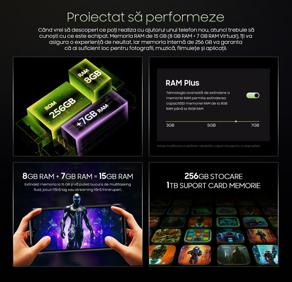 Joacă-te cu memoria RAM, experimentează, alege, simte performanța și trăiește aventura, nu trebuie să te mai oprești! Este telefonul tău, ai libertatea să alegi! Vrei mai multă memorie RAM față de cei 8GB pe care deja i-am pregătit? Nimic mai simplu, vei găsi în meniu încă 7GB pe care poți să-i adaugi pentru mai multă putere. Vrei spațiu de stocare mai mult? Găsești deja 256GB, o cantitate ultra mare, dar poți adăuga până la 1TB! Sună bine! Este un Titan!