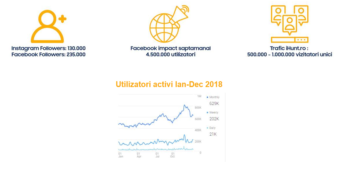 Marketing si promovare: Online, influencers. Impact mediu saptamanal: 4.5 mil. utilizatori Facebook, peste 130.000 followers Instagram, peste 235.000 followers pe Facebook.