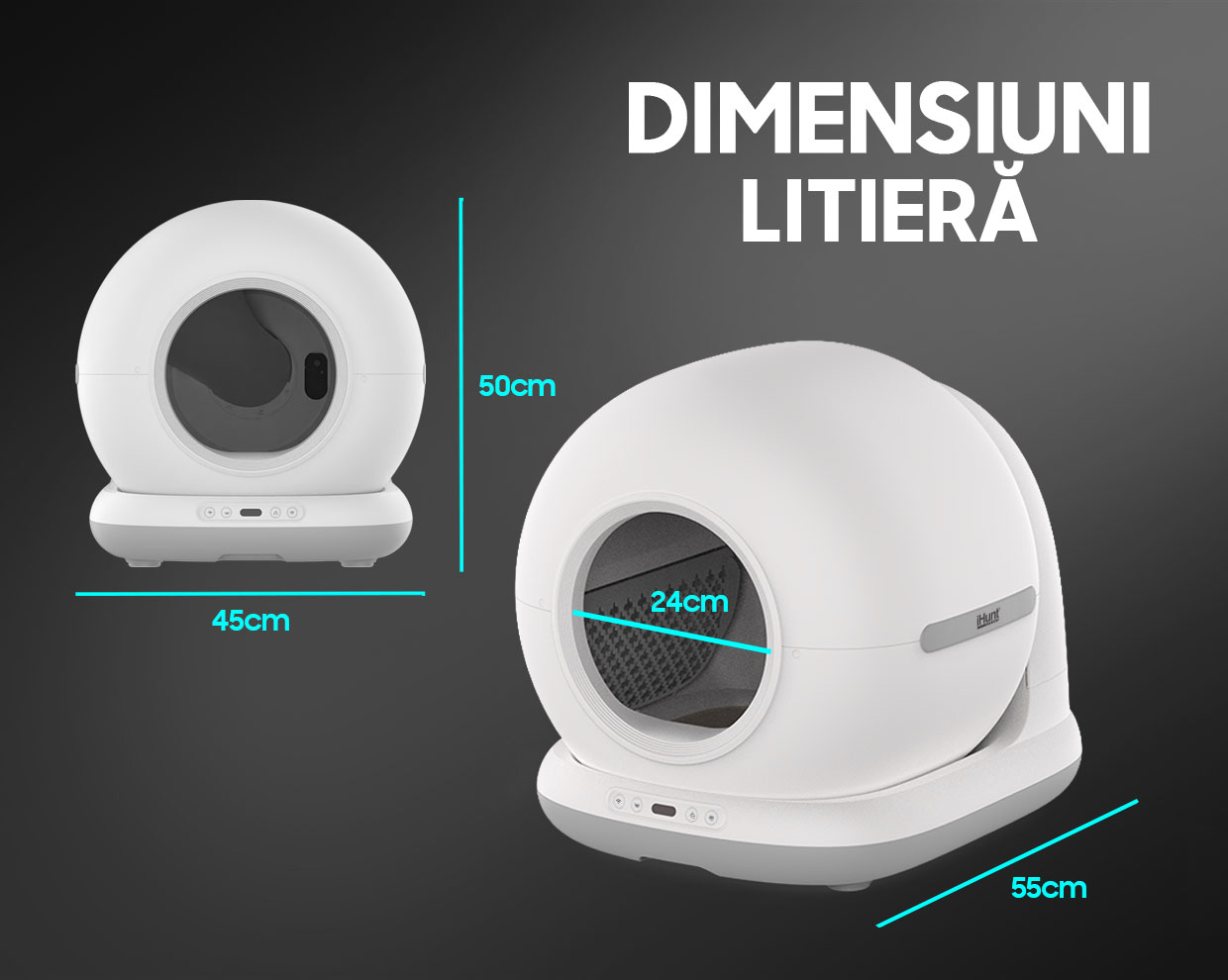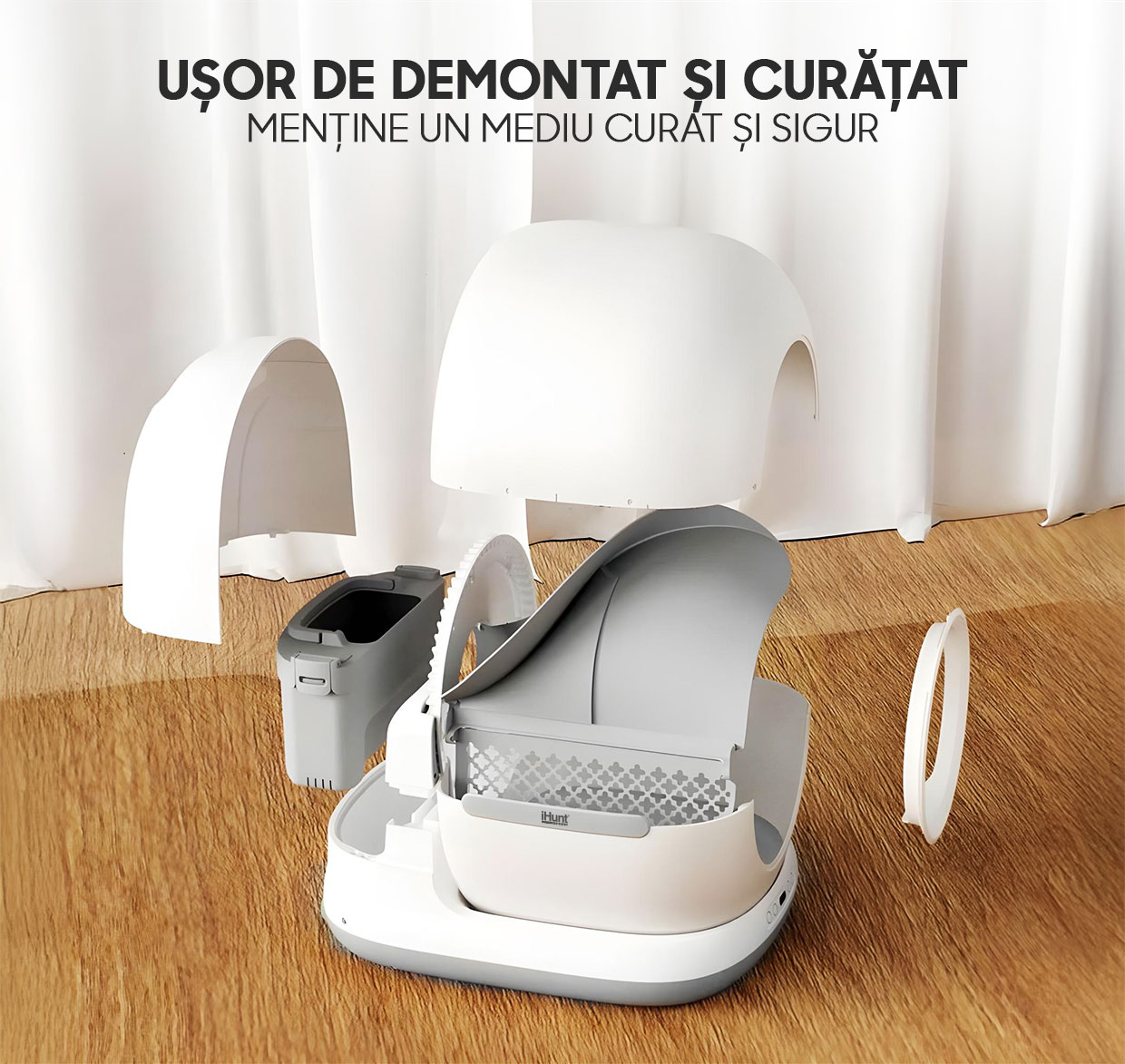 • ✨ Curățare automată și igienă completă – litiera se curăță singură imediat ce pisica iese.