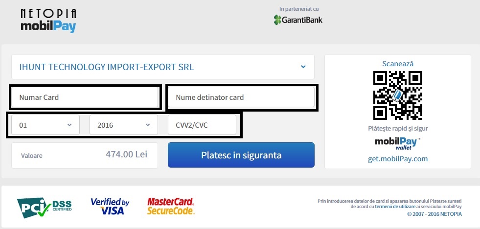 Pasul 3 - Completați în câmpul "Nume Deținător Card" numele complet așa cum apare pe fața cardului - Completați în câmpul "Număr Card" toate cele 16 numere care apar pe fața cardului - Selectați în câmpul "Lună Expirare Card" luna de expirare a cardului (cea care apare pe fața cardului ) - Selectați în câmpul "An Expirare Card" anul de expirare a cardului (cel care apare pe fața cardului ) - Completați în câmpul "Cod CVV2/CVC" codul de securitate online care este scris pe spatele cardului si este format din trei cifre - După completarea și verificarea tuturor câmpurilor menționate mai sus cu datele corecte, apăsați butonul "Plătesc în siguranță" pentru a finaliza și pentru a trimite comanda către noi