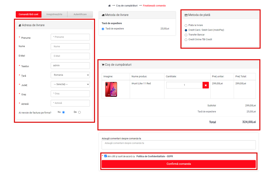 - Verificați încă odată toate detaliile comenzii dumneavoastră (produs / cantitate) - Puteți adăuga un comentariu care considerați că este necesar pentru comanda dumneavoastră - Citiți și apoi bifați căsuța aferentă câmpului obligatoriu "Am citit și sunt de acord cu Politica de Confidențialitate -GDPR" - Apăsați butonul "Confirmă comanda" pentru a plasa comanda dumneavoastră - Veți fi redirecționat automat către platforma unde urmează să introduceți datele cardului dumneavoastră cu care doriți să efectuați plata comenzii *dacă sunteți o persoană juridică / societate comercială și doriți emiterea unei facturi, vă rugăm să selectați opțiunea "Da" pentru câmpul "Ai nevoie de factura pe firma ?" , iar apoi să introduceți CUI-ul societății pentru care solicitați emiterea facturii *dacă cardul dumneavoastră este unul de credit / de cumpărături, atunci vă oferă posibilitatea plății în rate a comenzii dumneavoastră. Numărul ratelor fiind stabilit prin contract de către furnizorul dumneavoastră de servicii bancare (banca) unde aveți cardul introdus pentru plata comenzii dumneavoastră