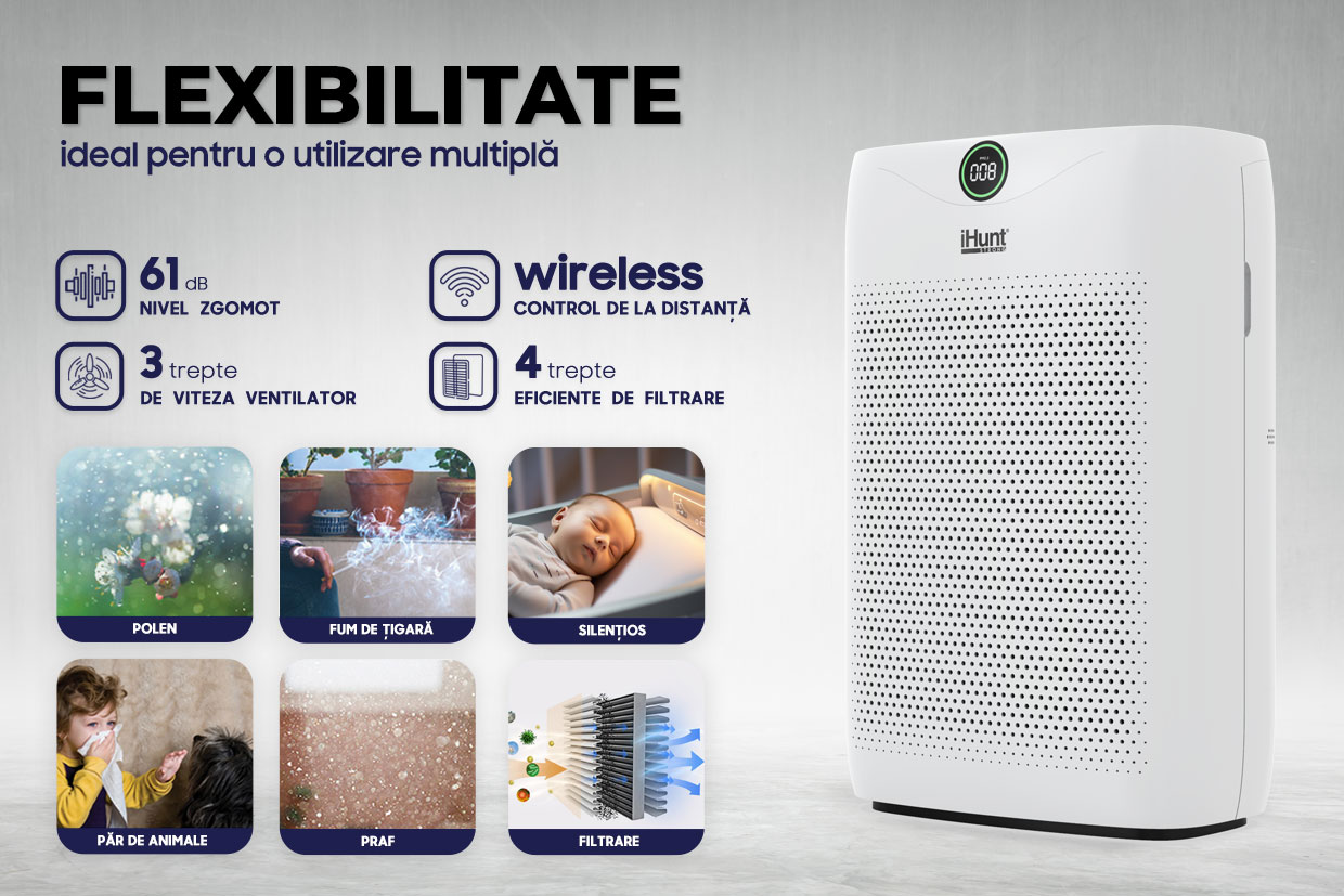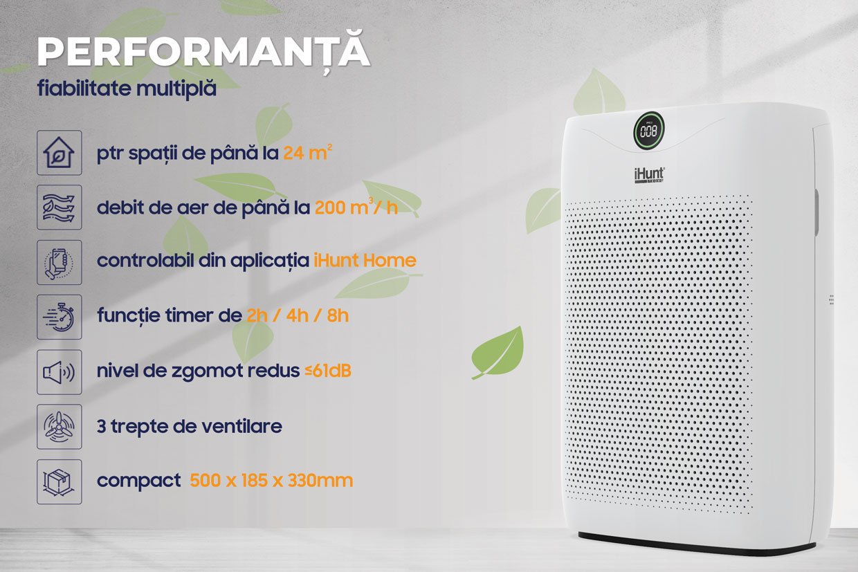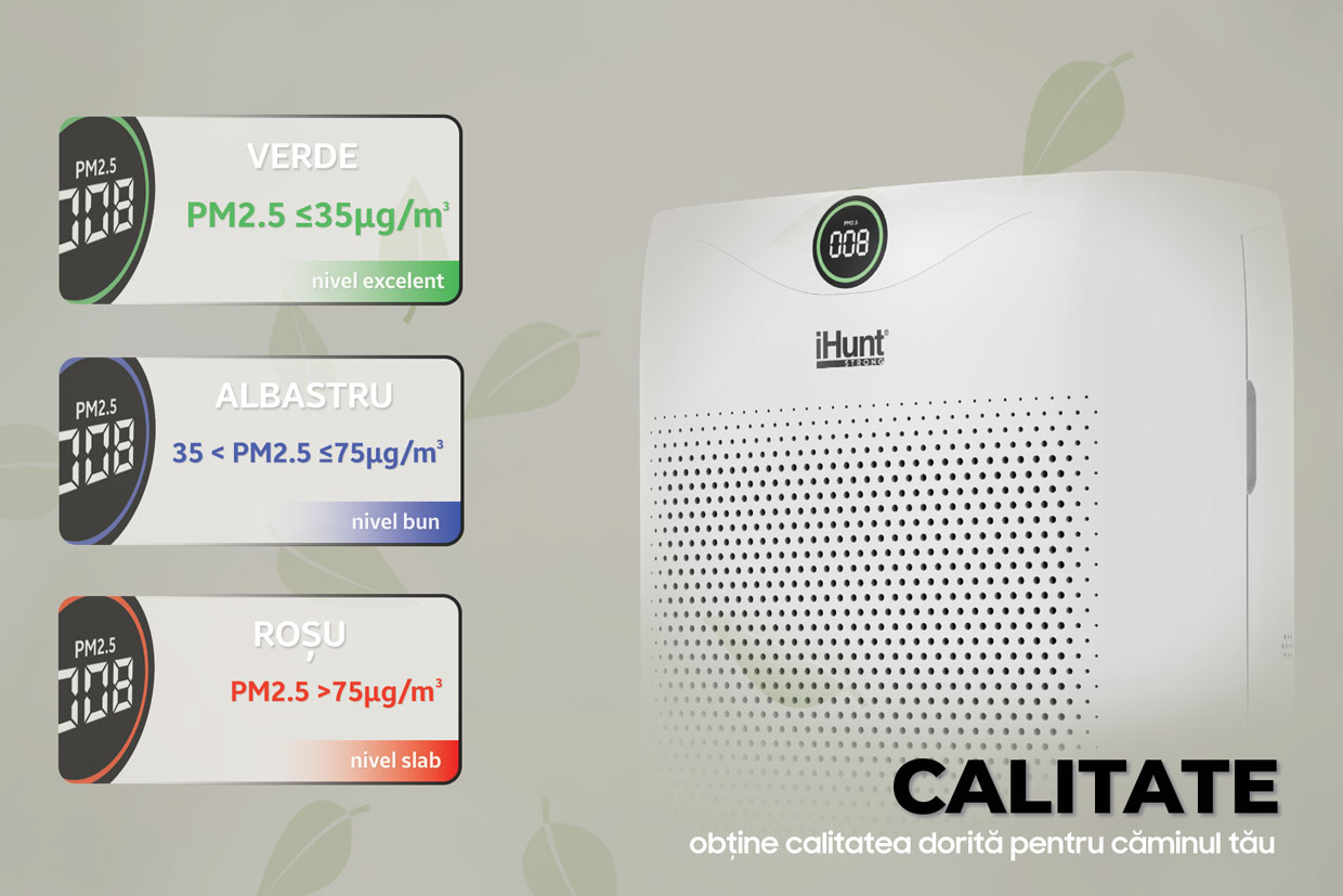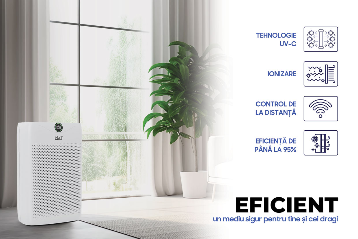 Dar ceea ce îl face cu adevărat remarcabil sunt caracteristicile sale avansate. Dotat cu ionizare, tehnologie UVC și un filtru HEPA, acest purificator iHunt nu doar că filtrează aerul, ci și elimină bacteriile și virusurile, oferindu-vă un mediu de viață mai sigur. Ionizarea ajută la neutralizarea particulelor din aer, în timp ce tehnologia UVC ucide germeni și microorganisme, asigurând astfel un nivel înalt de igienă.