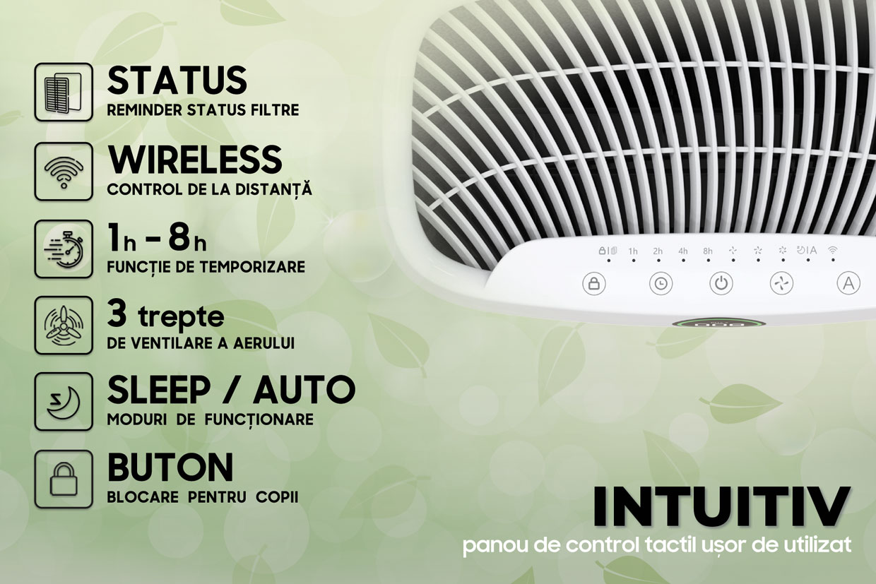 Funcția de temporizare adaugă un nivel suplimentar de comoditate, permitându-vă să setați perioadele de funcționare ale purificatorului în funcție de programul dumneavoastră. În plus, utilizarea aparatului este un adevărat joc de copii datorită panoului intuitiv de control. Iar pentru cei care preferă o abordare mai tehnologică, opțiunea wireless vă permite să gestionați setările purificatorului direct de pe dispozitivul mobil, oriunde v-ați afla. Smart!