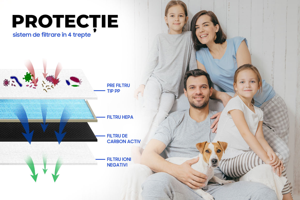 Și nu face compromisuri când vine vorba de eficiența sa în eliminarea particulelor nedorite și a poluanților din aer. Cu un sistem de filtrare în patru etape, este gândit pentru a oferi o purificare completă și eficientă.