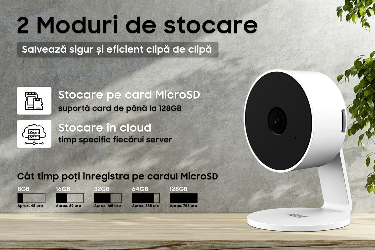 Chiar și sute de ore de vizionare, efectiv spațiul nu mai este o problemă și ar trebui să nu te preocupe. Este suficient să introduci un card de memorie de până la 128GB și deja poți pleca liniștit în vacanță. Dacă preferi o metodă mai sigură și care să-ți ofere și mai mult spațiu de stocare, cu ușurință poți apela la metoda de stocare în cloud!