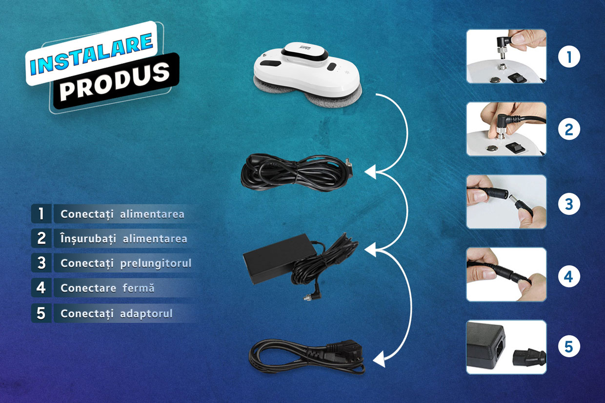 Instalarea este simplă și rapidă, chiar plăcută în comparație cu momentele neplăcute pe care le aveai atunci când foloseai metodele clasice. După ce își termină treaba, îl poți pune la încărcat într-un mod rapid, elegant și sigur. Apoi, va fi gata și nerăbdător pentru o nouă sarcină, Soarele va intra din nou prin geamurile tale. Bucură-te de el și de noul tău prieten inteligent și curat !