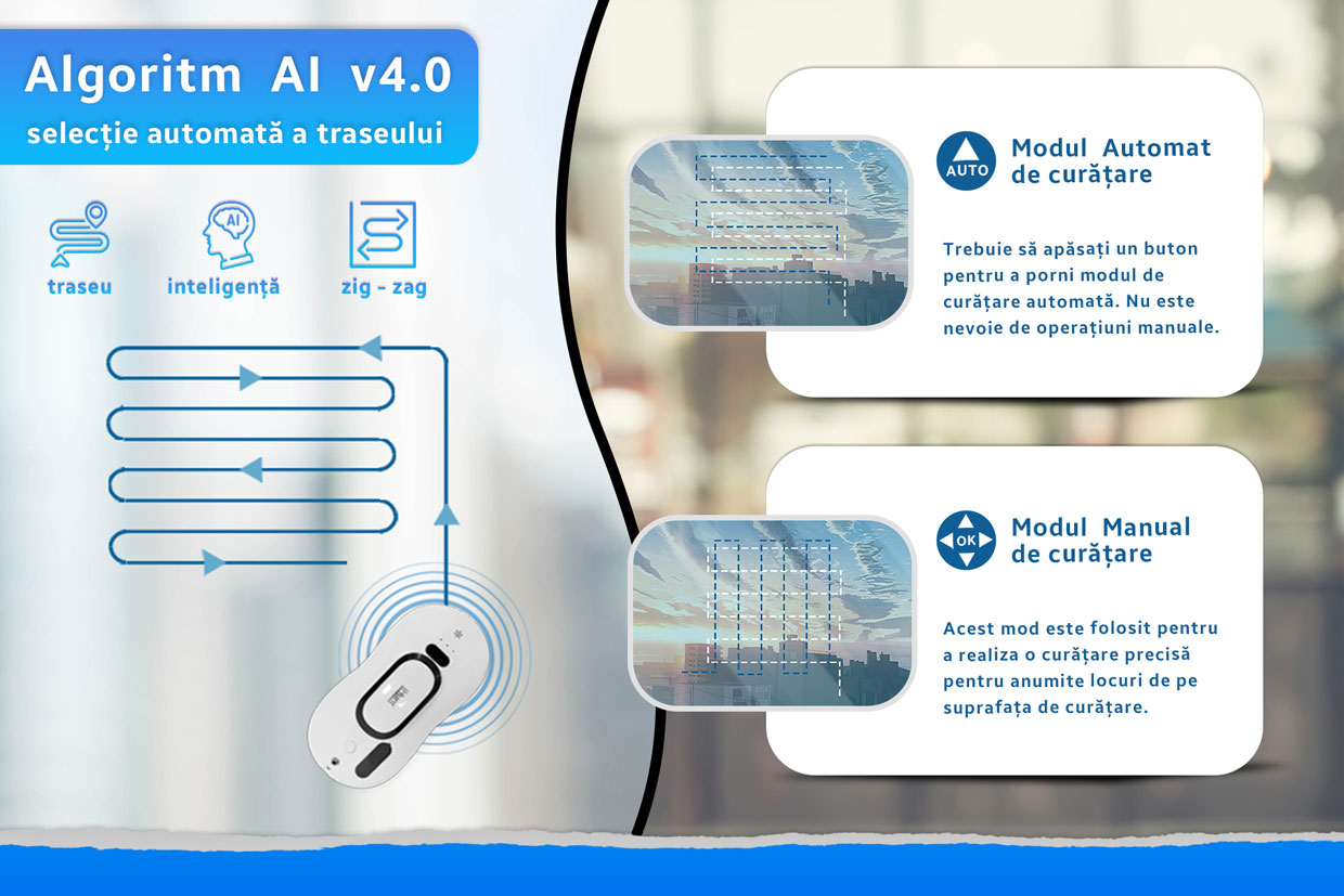 Cum poate fi atât de inteligent și ce înseamnă până la urmă asta în cazul unui dispozitiv menit să curețe geamurile ? Am implementat un algoritm special pentru selecția automată a traseului, tu vei apăsa un singur buton și el se va ocupa de restul. Va știi pe unde trebuie să se ducă, pe unde a mai fost și unde trebuie să ajungă. Exact, inteligent și inedit ! Ești o persoană extrem de pretențioasă și vrei să insiste în anumite zone ? Există rezolvare, trebuie numai să folosești modul manual. Soluții multiple și precise, rezultate care chiar se văd !