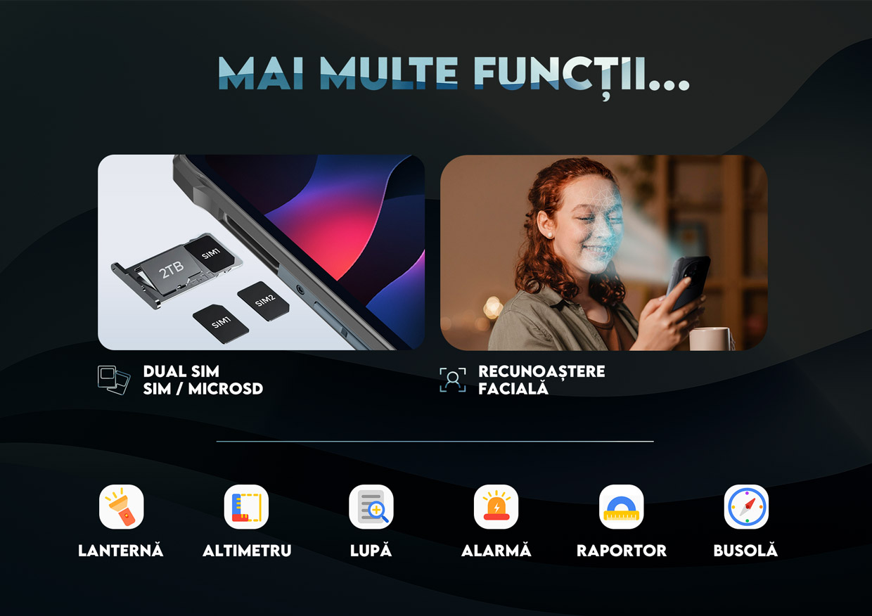Ți-am pregătit inclusiv un folder plin cu aplicații utile, dedicate stilului tău. Pentru aventurieri sau pentru locul de muncă, gata de a fi testate oriunde. Sunt gratuite, precise, nu te vor stresa cu conturi sau setări inutile! Îți dăm și posibilitatea de a introduce 2 cartele SIM sau dacă dorești și ai nevoie de mai multă memorie internă, poți să introduci un card MicroSD. Vrei deblocare fără atingere? Nimic mai simplu! Mai multe funcții, mai multă performanță, mai multă rezistență. Trebuie să-l cunoști!