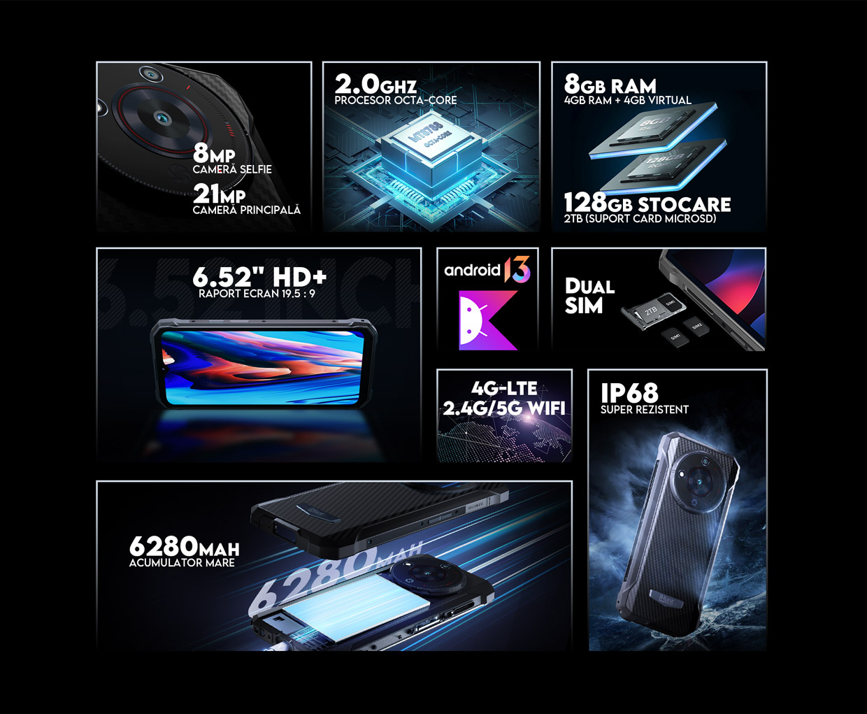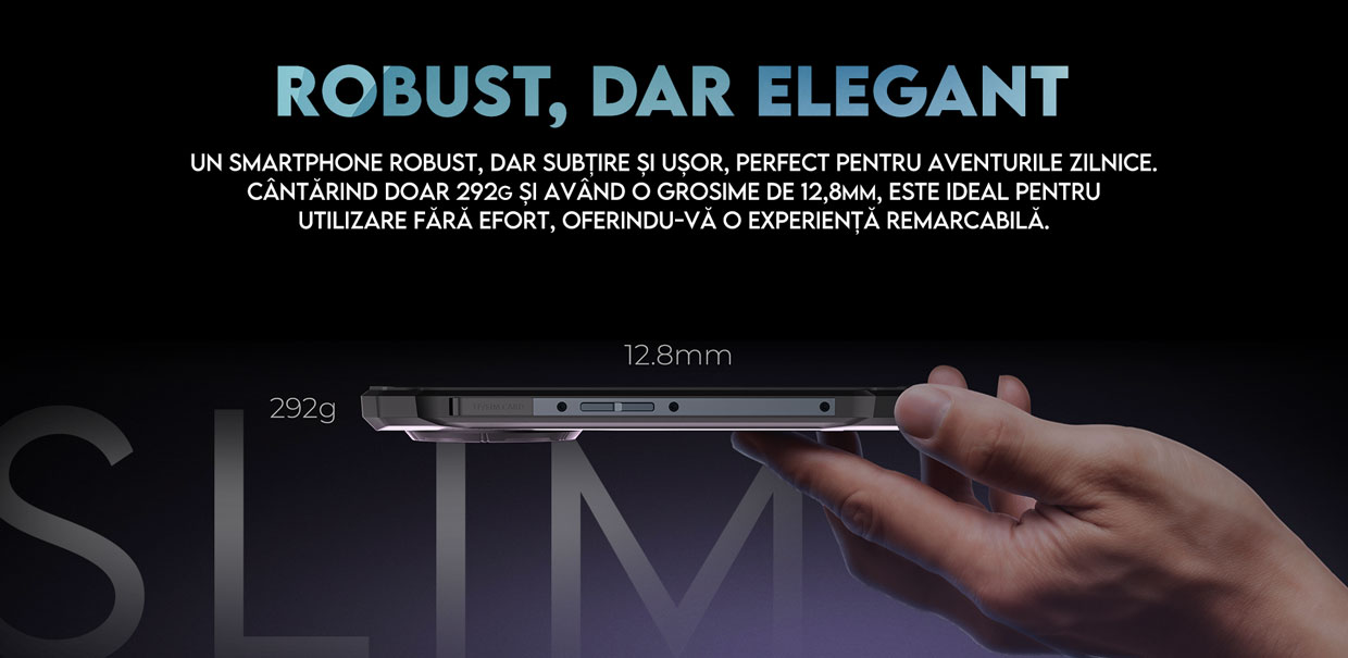 Stai să-ți spun ce te va surprinde foarte plăcut! Este un telefon robust, dar incredibil de subțire - doar 12,8 mm! Îl ții în mână și simți că e făcut special pentru tine. Cu o greutate de doar 292 g, e ușor de purtat oriunde, fără să-ți pese. Este potrivit atat pentru utilizarea zilnică cât și pentru situații speciale.