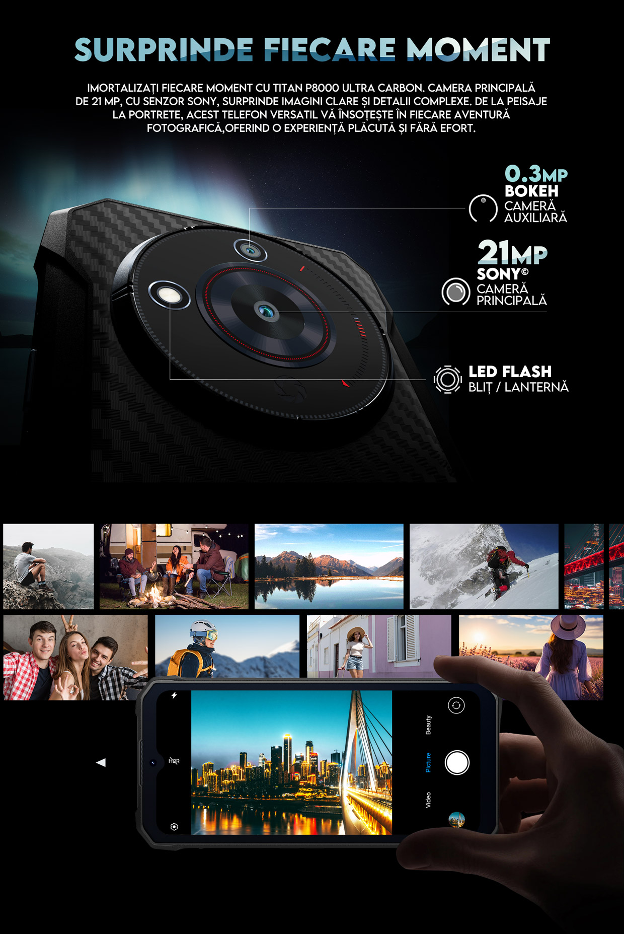 O calitate excelentă pentru un clip pe care să-l postezi rapid pe rețelele de socializare, poate un TikTok cu mii de aprecieri sau o conversație video în condiții perfecte. Un selfie, un moment, o secundă, o aventură, o amintire! Și pentru că este un telefon special pe care să-l iei cu tine oriunde, este clar că ai cele mai mari șanse să impresionezi și să te îndrepți spre aventura adevărată. Ia-l cu tine, este iHunt Titan P8000 Ultra Carbon, noul tău prieten!