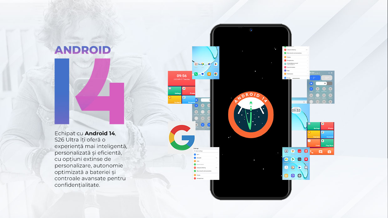 •    ✅ Android 14 – interfață modernă, rapidă și sigură