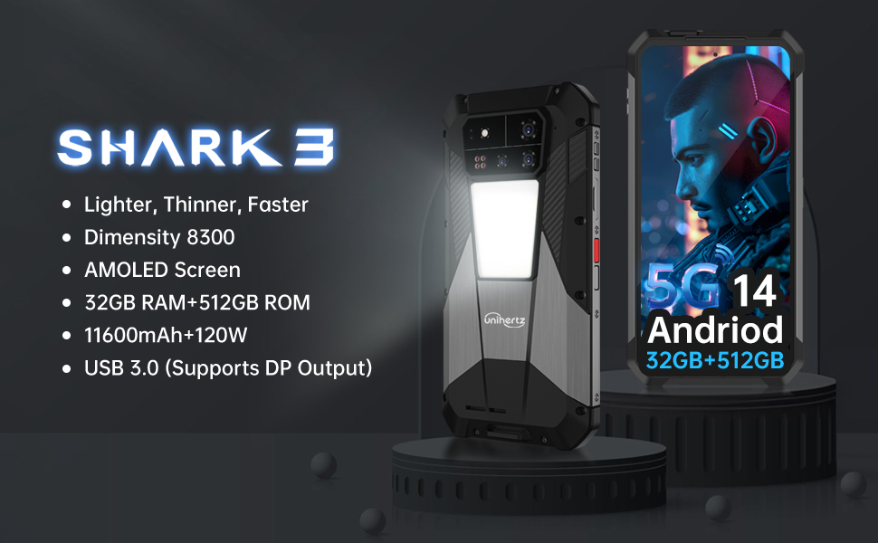 Unihertz Shark 3 reprezintă smartphone-ul rugged flagship revoluționar care combină performanță nivelul premium cu durabilitate extremă profesională certificată: ecran spectaculos AMOLED de 6.73 inchi cu rezoluție 3K impresionantă (1440x3200 pixeli) și rată reîmprospătare 120Hz pentru fluiditate maximă, procesor flagship MediaTek Dimensity 8300 fabricat în proces avansat 4nm cu scor AnTuTu record 1430000 pentru performanță absolut top tier, 32GB RAM total prin tehnologie expansiune (16GB fizic LPDDR5X ultra-rapid + 16GB virtual), stocare premium 512GB UFS 4.0 ultra-rapidă expandabilă până la 2TB prin microSD, baterie mare de 11600mAh cu încărcare revoluționară 120W (90% în doar 60 minute), sistem triple-cameră profesional cu 50MP Samsung main + 64MP night vision infraroșu + 50MP telephoto zoom 3x OIS plus cameră frontală 32MP, conectivitate 5G completă globală, WiFi 6, Bluetooth 5.3, NFC, GPS dual-frequency L1+L5 cu patru constelații pentru precizie maximă, port USB-C 3.0 cu ieșire DP pentru conexiune directă TV, certificări IP68/IP69K/MIL-STD-810H pentru durabilitate extremă, Android 14, lampă camping puternică, butoane programabile duble și design compact surprinzător - doar 470g greutate și 22.5mm grosime.