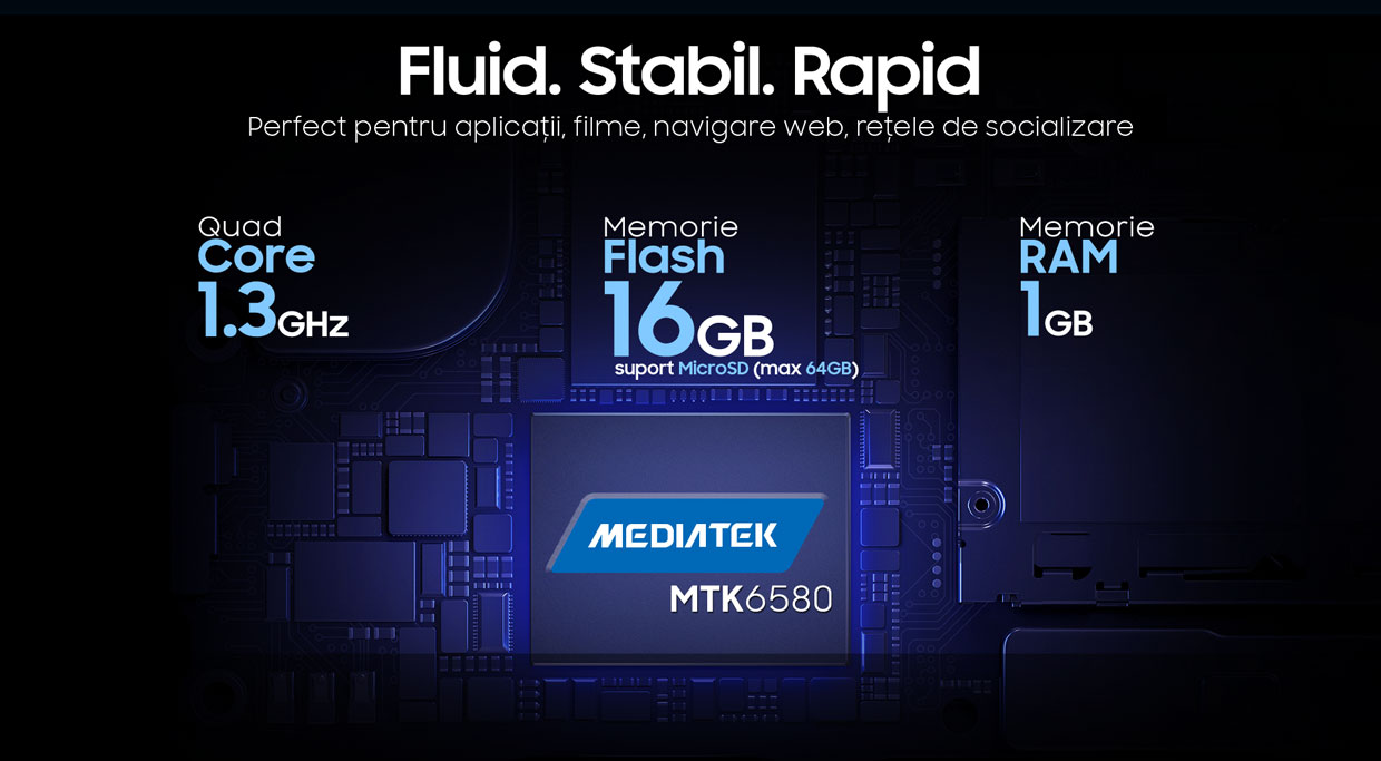 Puterea de procesare vine din interior și se simte la exterior ! Am ales un procesor cu 4 nuclee pentru a oferi sistemului de operare o viteză optimă și o stabilitate crescută. Dacă te pasionează foarte mult datele tehnice, îți spunem că noul tău telefon are 1GB memorie RAM și direct 16GB stocare internă. Da, poți introduce suplimentar și un card de memorie !
